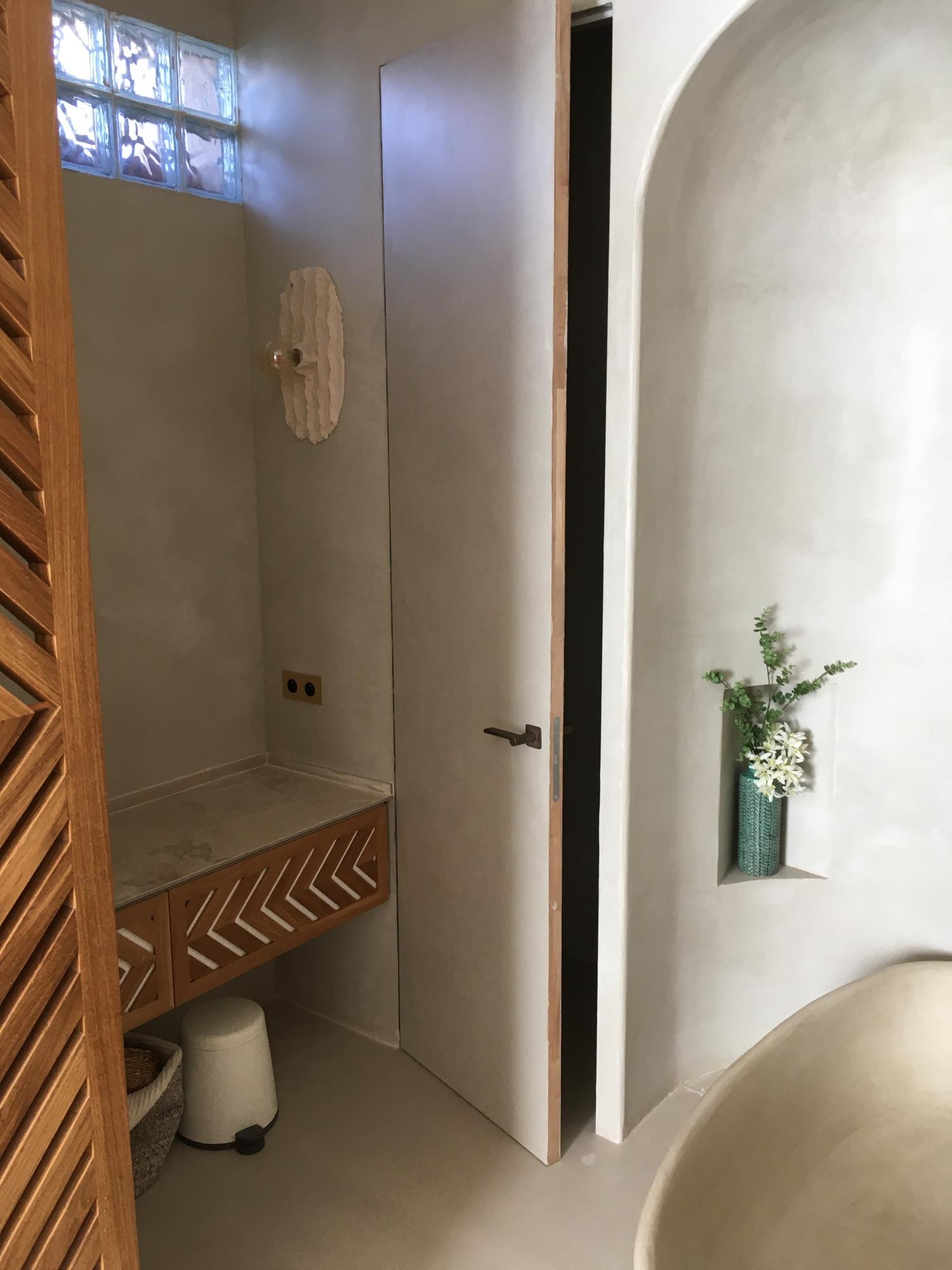 La petite porte de cette salle de bain donne sur un wc, dont les murs sont également enduits en béton ciré.