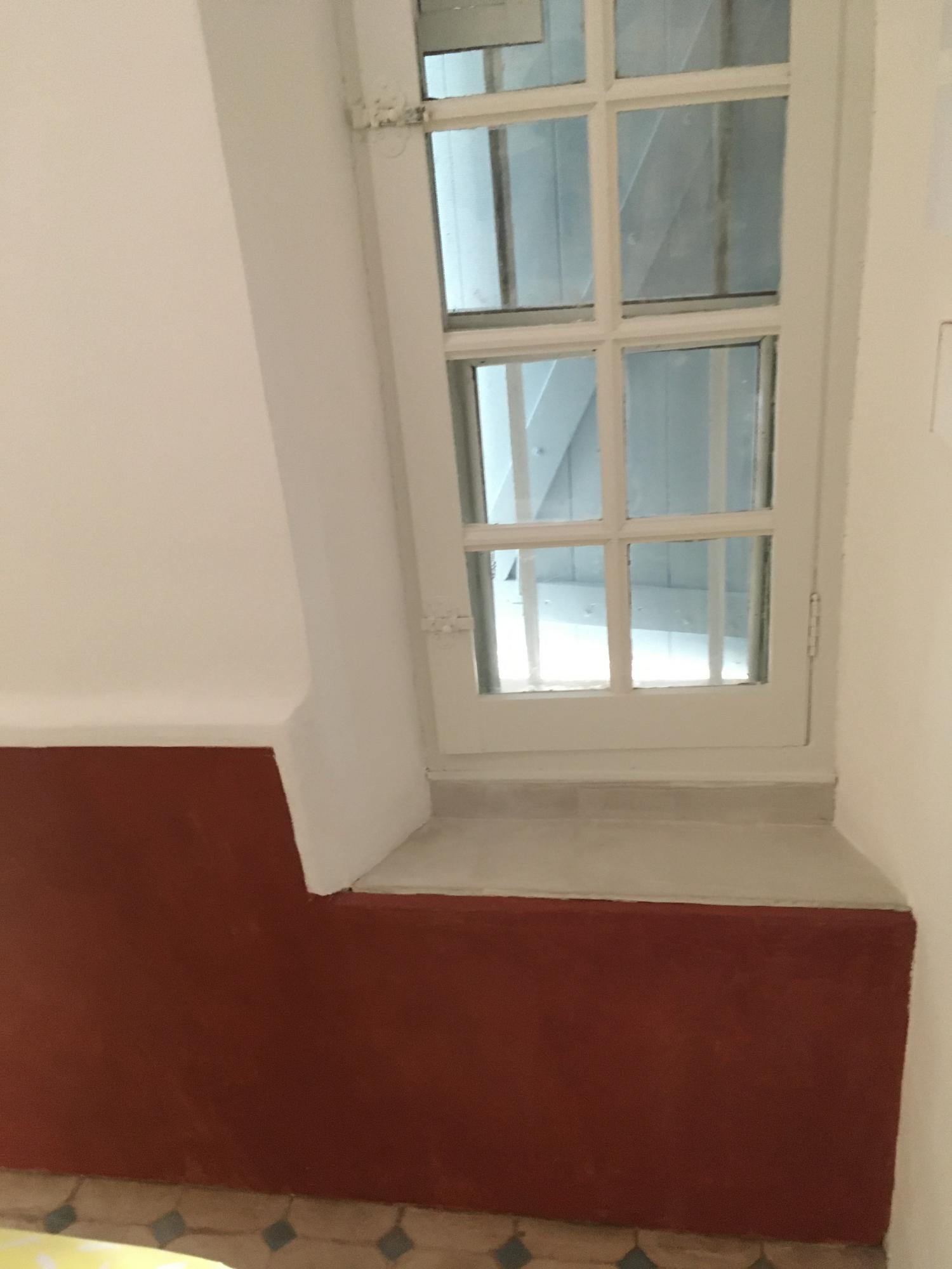Outre les carreaux de ciment, typique de la fin du XIX è s., du béton ciré a recouvert les anciens supports en terres cuite, effrités, en très mauvais états. la pile en pierre a été conservée et la crédence a été réalisée dans un béton ciré ton pierre clair, alors que pour le bas, une couleur rouge brique a été adoptée par le client.