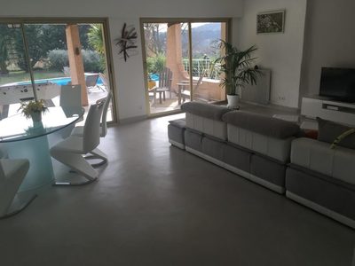 Sol en béton ciré de 80 m2, dans une villa de St Anne du Castellet. Le mortier fin destiné à l'effet "béton ciré" est appliqué sur un ancien sol carrelé en terre cuite , après application d'un ragréage spécial et d'une trame (ou treille) grillagée en fibre de verre. L'épaisseur surajoutée au sol initial est de 3 à 5 mm maximum. Le choix du gris clair reprend l'esprit "loft" et insuffle une ambiance et un aspect contemporains et "designs".